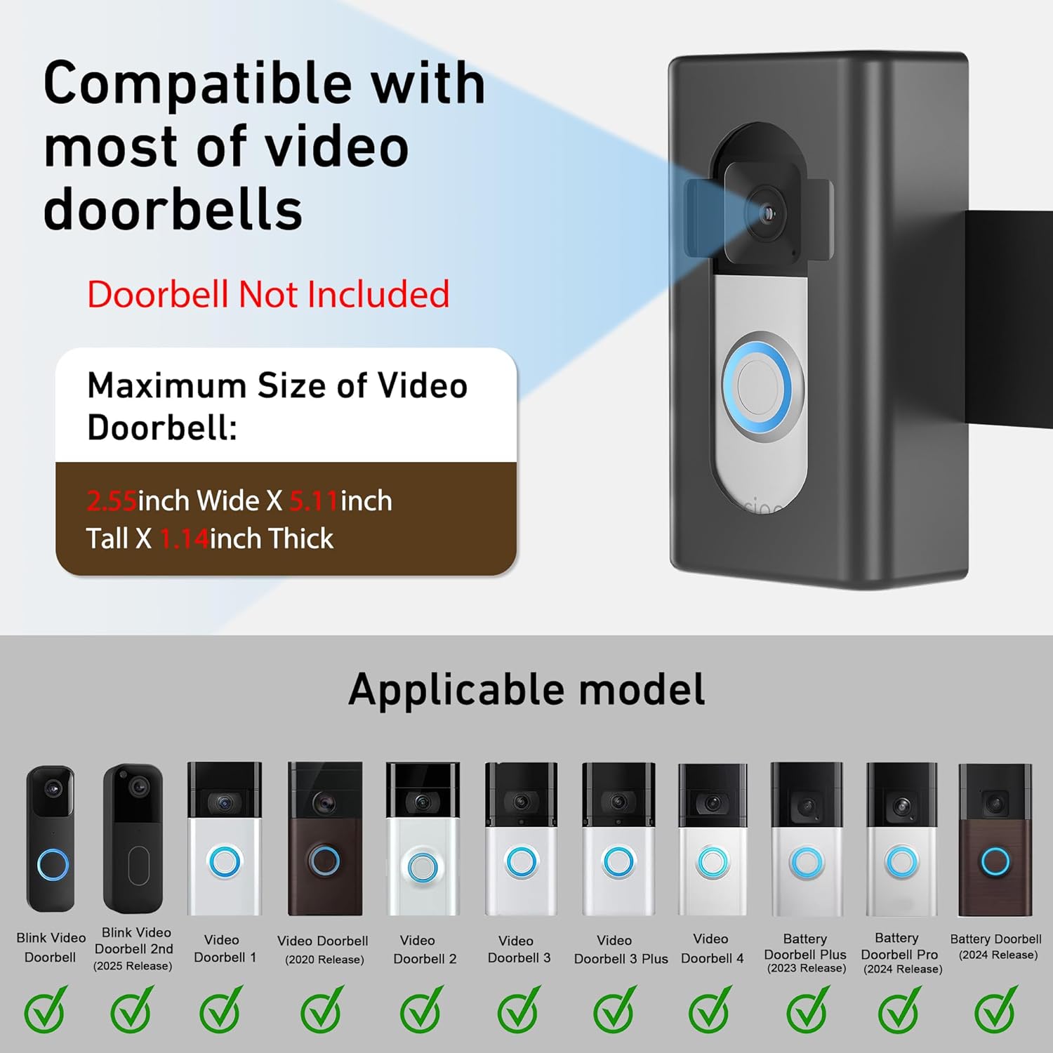 Applicable Doorbell Model: The size of the doorbell that can be placed inside is not more than 2.55inches Wide x 5.11inches High x 1.14inches depth.Anti-Theft Video Doorbell Mount compatible with Ring Video Doorbell / Video Doorbell 2 / 3 / 3 Plus / 4 / Video Doorbell (2020 Release) and Ring Battery Doorbell Plus/ Pro (2023/ 2024 Release) & Battery Doorbell (2024 Release) and Blink Video Doorbell 1st Gen and 2nd Gen (newest model). (Doorbell is Not Included in Package)