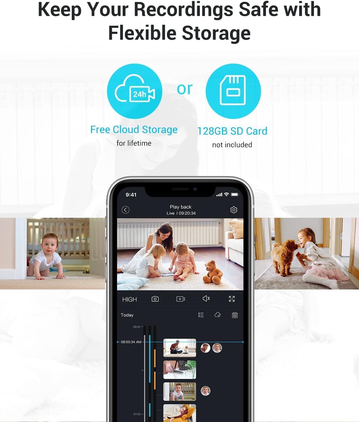 【Optional Cloud & Local Storage】 24/7 CVR enables the indoor security camera to keep a nonstop recording in the cloud, avoid the risk of losing video footage from a memory card. According to the time, events type or the camera name’s to search the specific event quickly. Supports up to 128GB SD card. Live viewing 4 security cameras simultaneously on blurams App or official web portal.