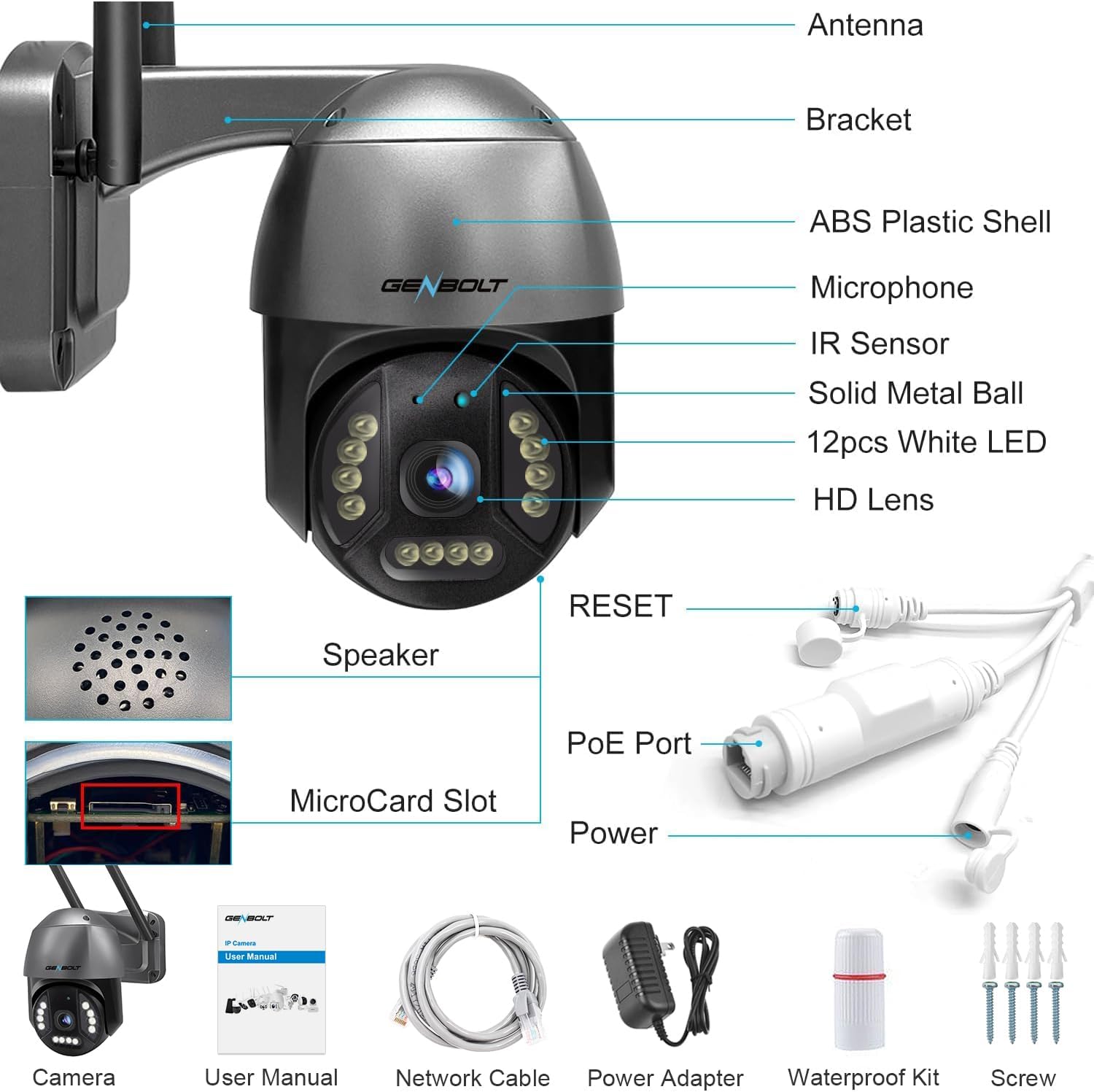 【Functional Preset Points & PoE Installation】With GENBOLT wireless security camera outdoor, you can locate the target rapidly without slide screen, cover any area that needs to be detected.Thanks to Power over Ethernet (PoE) technology, the Weak Current PoE camera can help you save the extra cost of hiring professional engineers,and transmit the power max up to 200 meters.