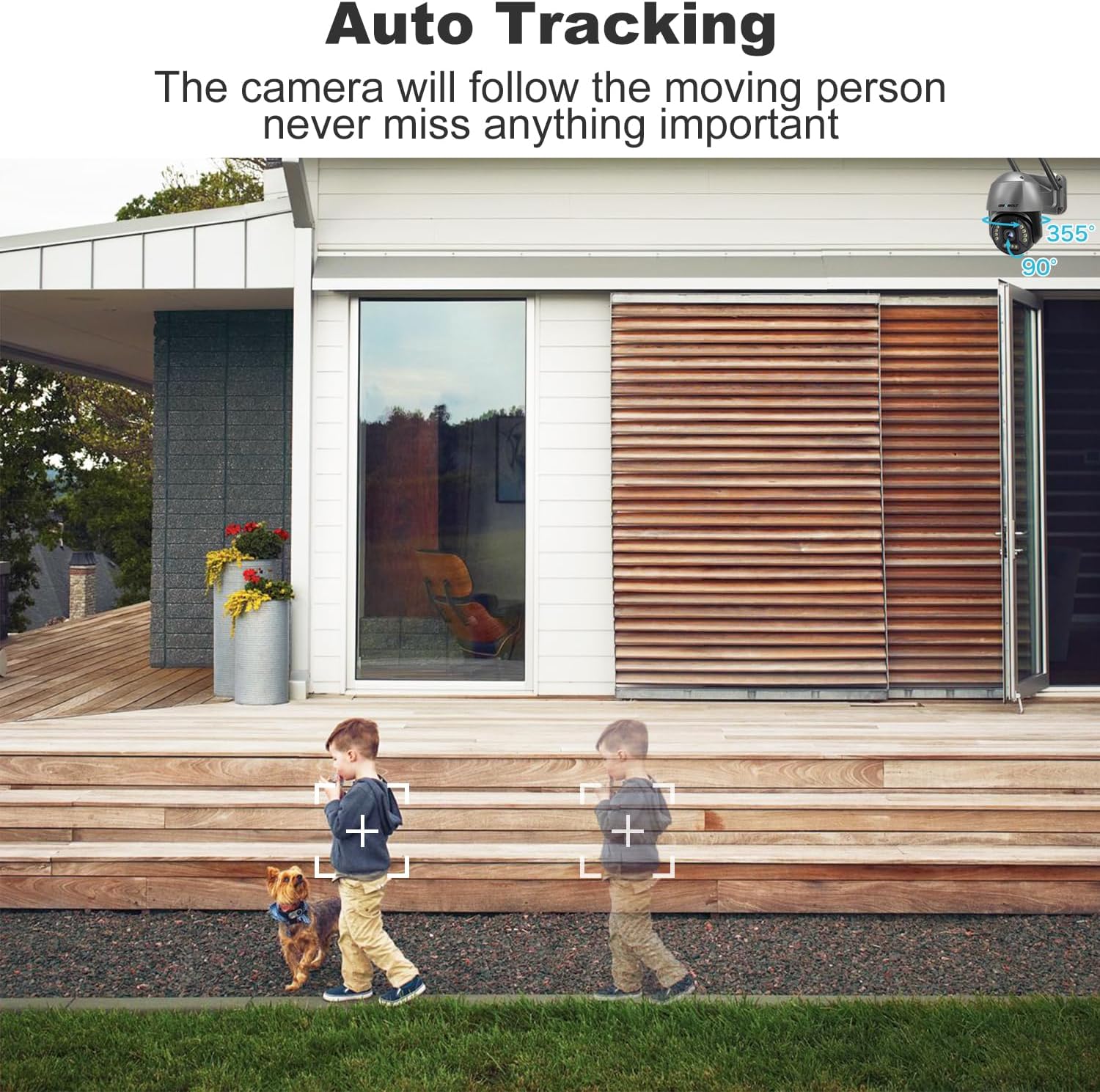 【2.4/5 GHz Dual-Band WiFi & Auto tracking】 The Dual-band camera supports 2.4GHz and 5GHz wifi, providing you with a high-speed and stable WiFi connection. This home security camera offers 355° horizontal and 90° vertical and a 4x digital zoom. Once in the surveillance camera area, it will automatically track people’s paths for more detail.