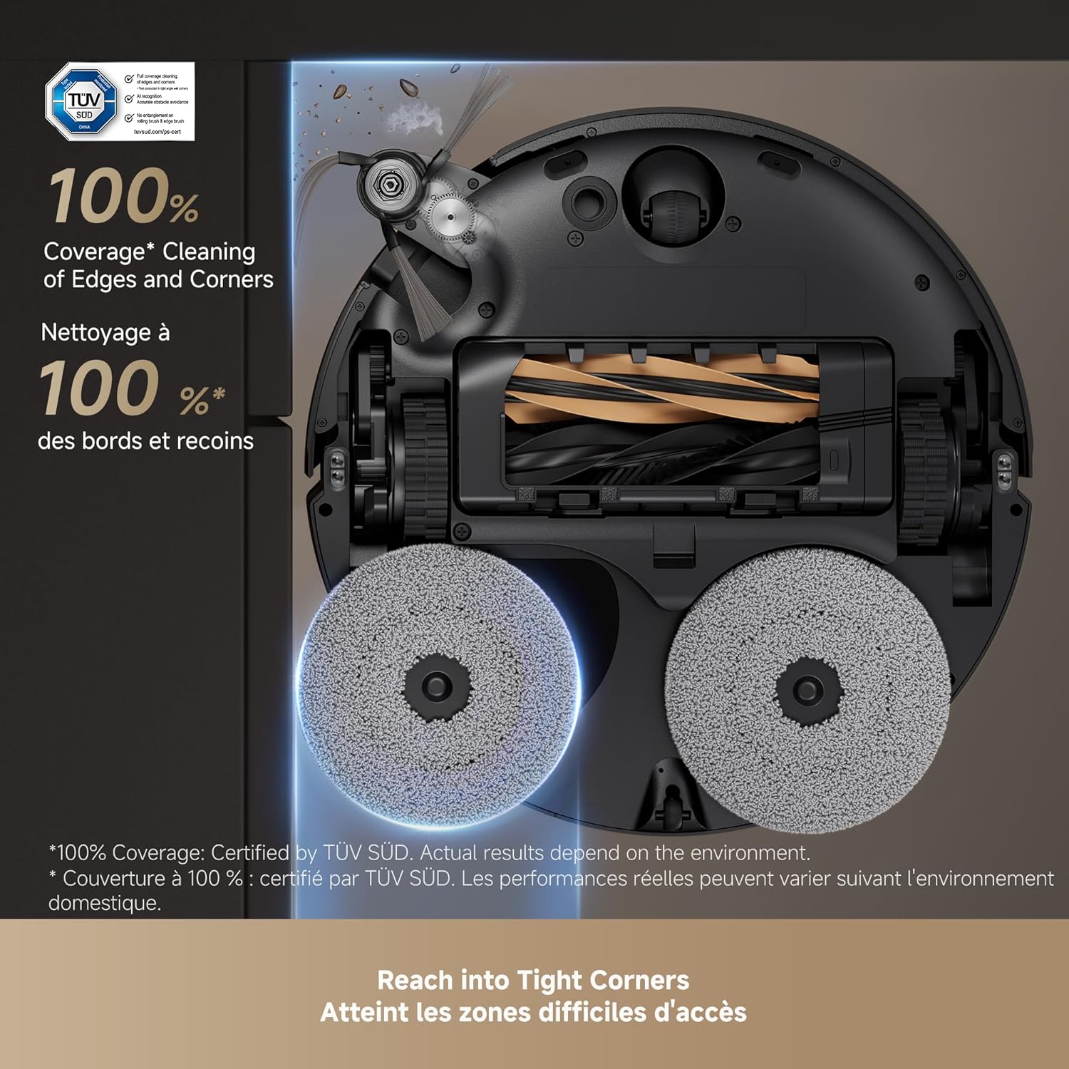 Easily Clean Under Sofas and More: VersaLift Navigation lowers X50 Ultra height to 3.5 in, allowing it to navigate under furniture easily. The AI camera with LED guidance in tight spots ensures precise navigation and obstacle avoidance