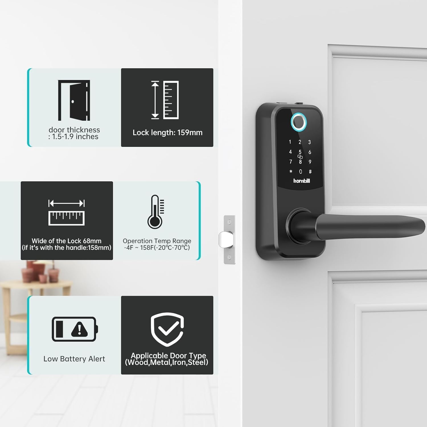 5-in-1 ways to unlock: Hornbill smart lock can be unlocked and locked via IC card, passcode , APP remote control, fingerprint,physical key.It supports multiple people to enter fingerprint passwords, and has the world’s leading fastest and best security identification system. The unlocking can be recognized in 0.5 seconds, and the accuracy rate is as high as 99.86%. Don’t worry about not being able to open the door because you forgot your keys or smartphone.