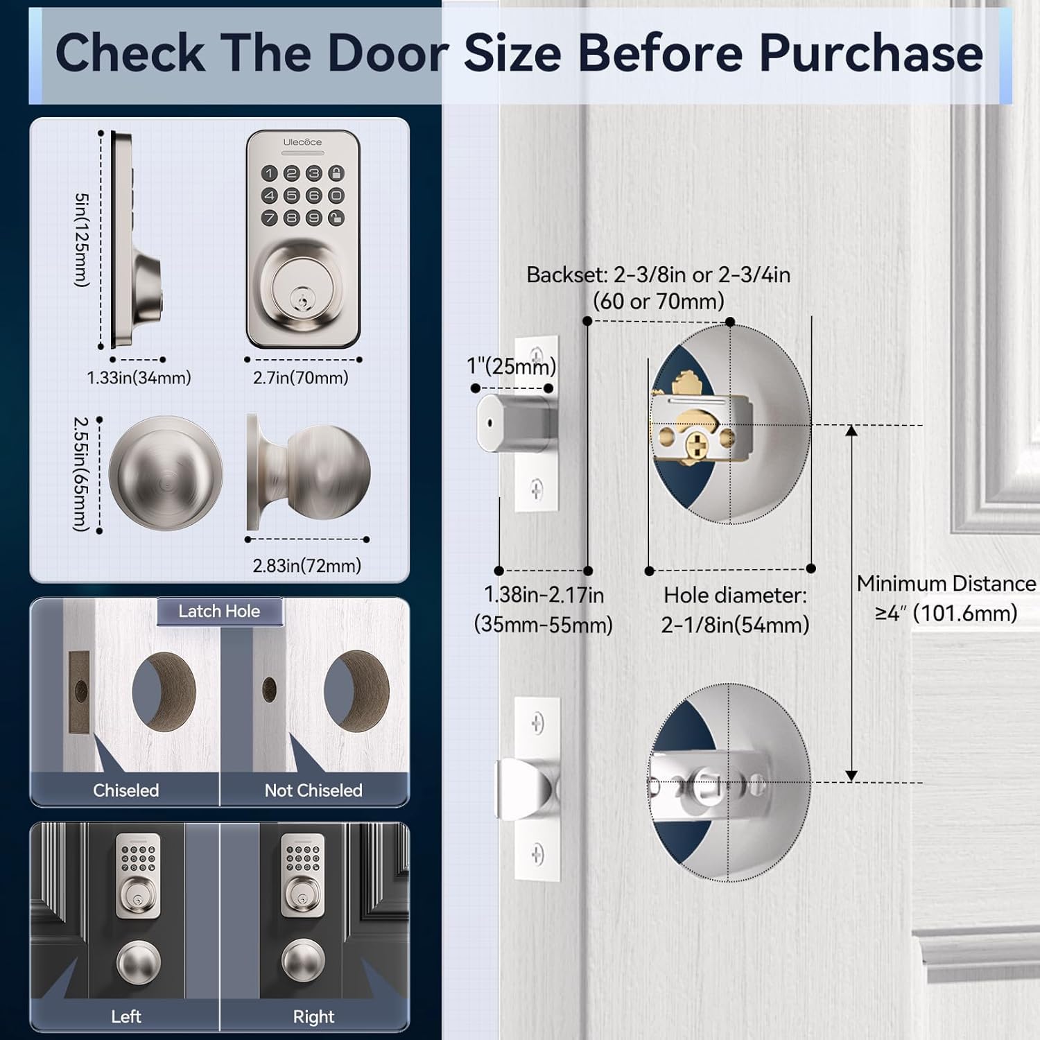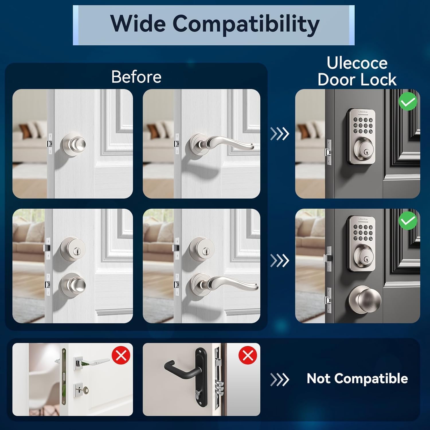 Easy to Install: The Ulecoce door locks for front door no extra drilling and costly locksmith required, just use a screwdriver to easily install and program the door lock in 15 minutes. It is compatible with left and right-hand doors.