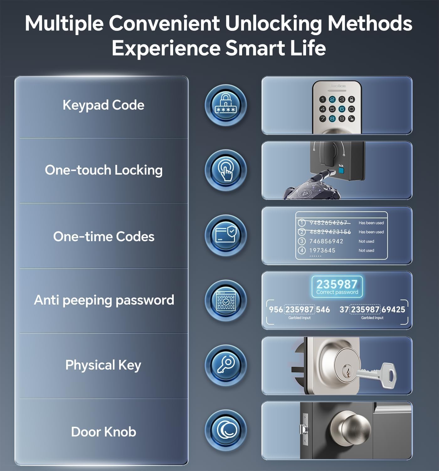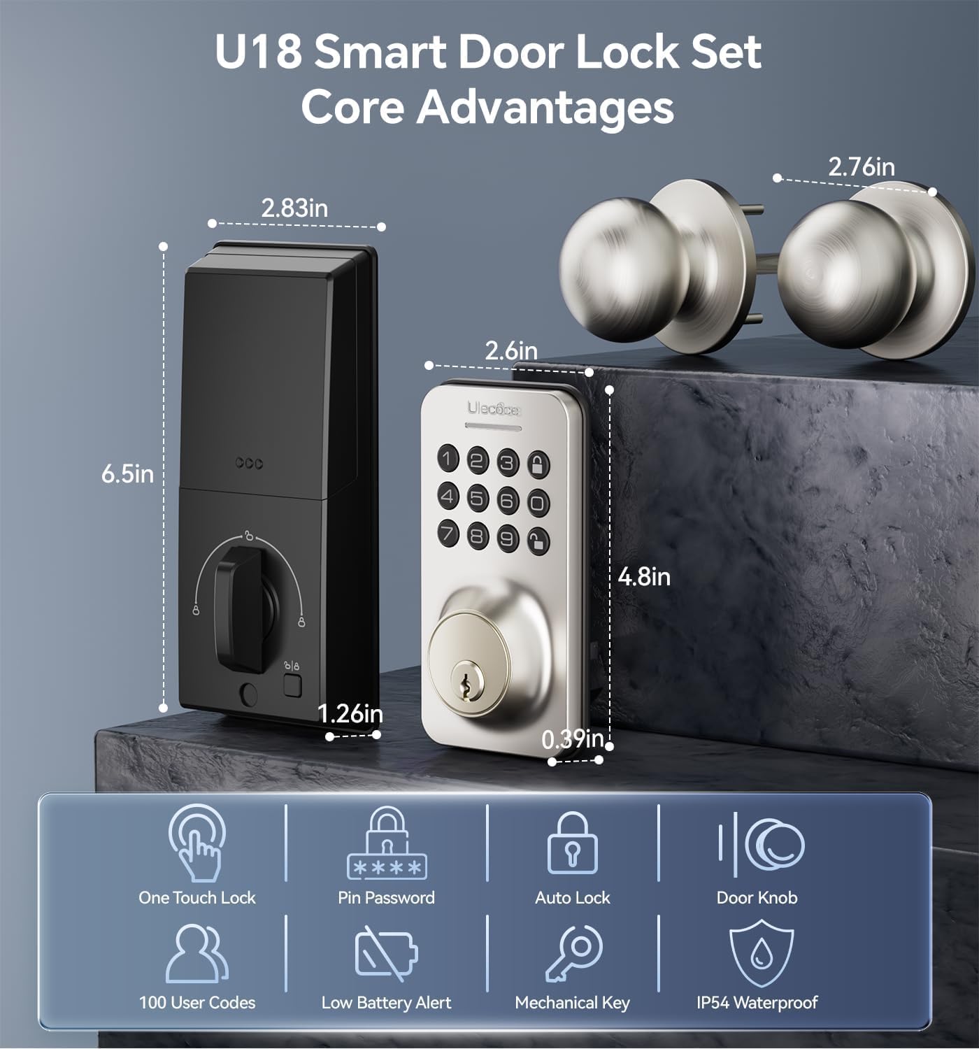 Keyless Entry Deadbolt with Handle Set: Ulecoce keyless entry door lock deadbolt with handle set supports multiple ways to access, 100 user codes, one- time code, 2 backup keys. Provide different unlock methods for family, friends,cleaners and Airbnb guests.