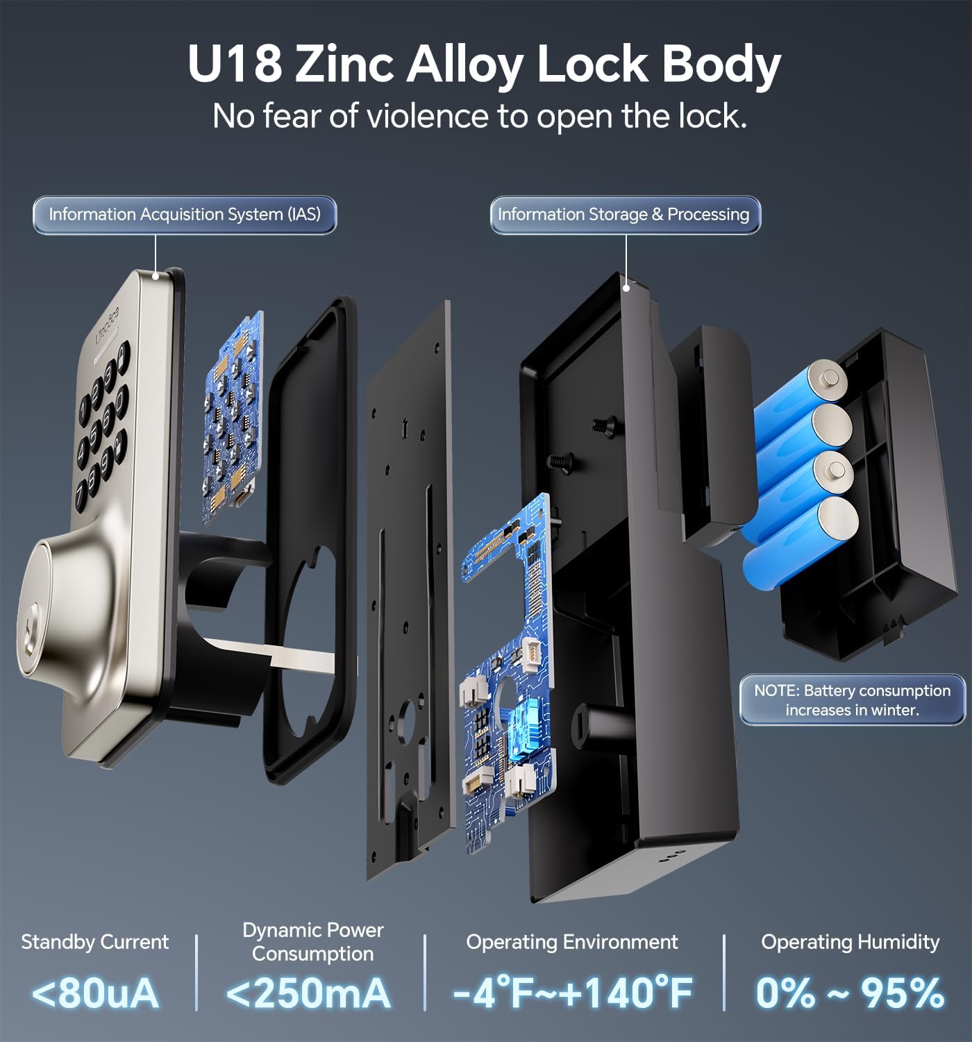 Security Deadbolt: Our keypad door knob system features an ANSI Grade 3 smart door lock cylinder made of zinc alloy lock body and powered by 4 AA batteries,It also has an IP54 weather resistance rating.
