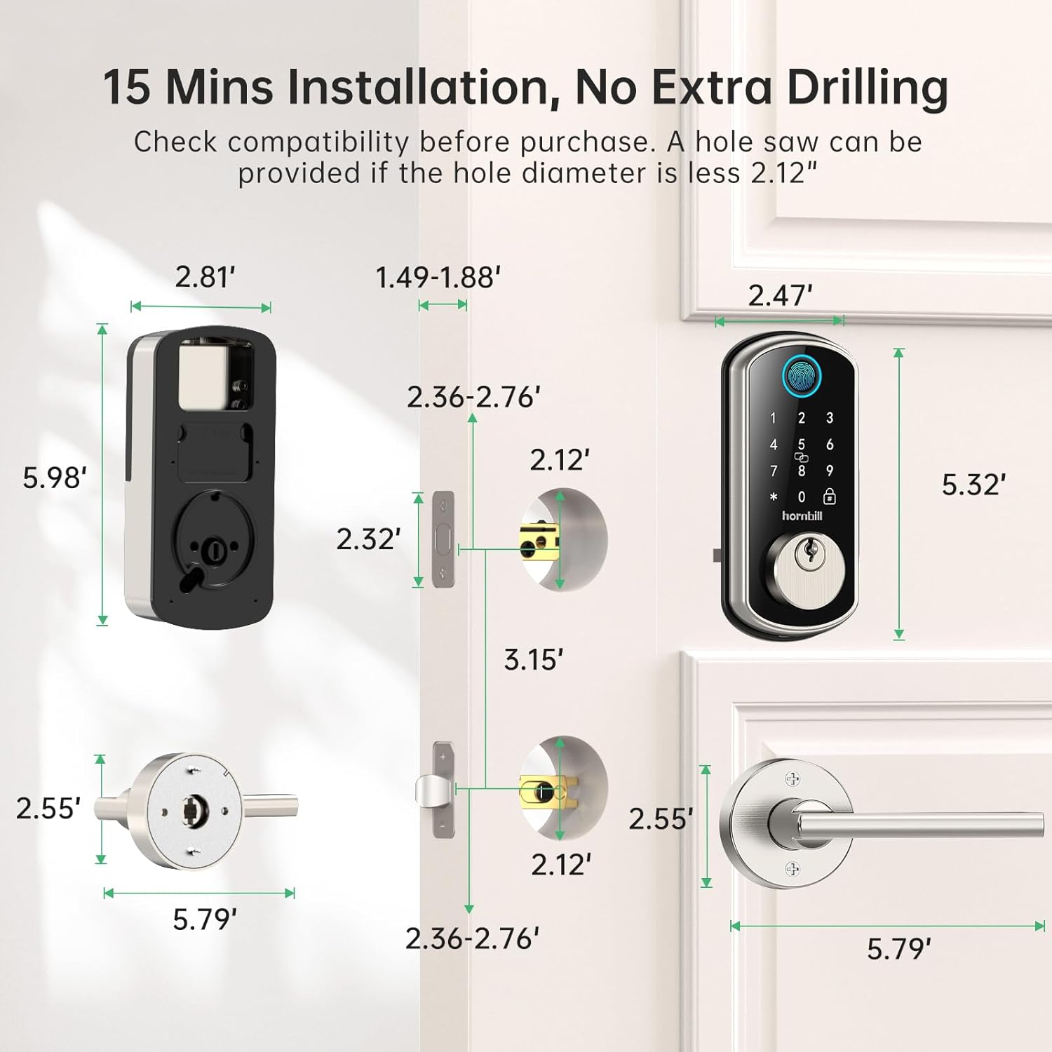 Build to Last :After Multiple tests, hornbill Smart Front Door Lock Set can operate well under -4 °F-158 °F (-20℃-70℃) with an IP65 Waterproof Level. Feature Shock Resistance + Anti-Peep Keypad + + Long Battery Using Time (Approx 20000+ times Lock/Unlock).